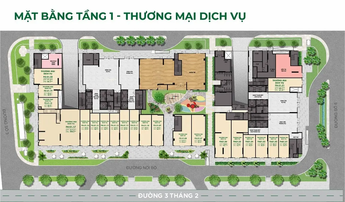 Mặt bằng tổng thể được thiết kế để tối ưu luồng di chuyển nội khu, giảm thiểu giao cắt không cần thiết và nâng cao trải nghiệm sử dụng hàng ngày.